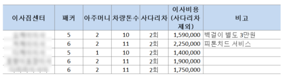 이사 견적을 받을 때 엑셀 파일을 확인해보니, 똑같은 짐이라도 이사짐센터마다 패커 숫자, 아주머니 숫자, 차량 톤수 등이 다른 것을 확인할 수 있습니다.