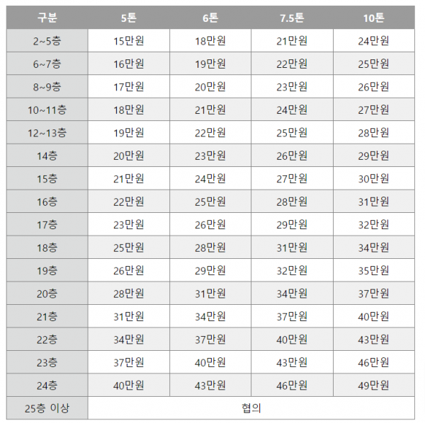 24층인 경우 사다리차 사용이 제한되거나 추가 비용이 발생할 수 있으며, 엘리베이터를 사용할 경우 이삿짐센터의 추가 인건비가 발생할 수 있습니다. 이러한 안전 및 비용 상의 이유로 이사업체와 협의할 필요가 있습니다.